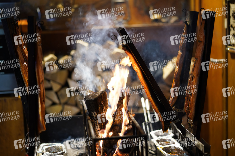 Am offenen Feuer gegrillter Lachs auf dem Weihnachtsmarkt am Roten Rathaus. Berlin, 02.12.2022