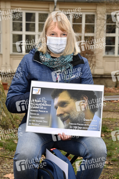 Astrid Vehstedt bei der Pressekonferenz des KulturForum TürkeiDeutschland zur Solidarität mit den gesamten demokratischen Kräften in der Türkei, insbesondere mit inhaftierten Schriftsteller*innen, Künstler*innen, Journalist*innen, Gewerkschafter*innen und Politiker*innen vor dem Maxim Gorki Theater. Berlin, 23.03.2021