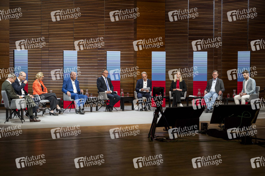 Nikolaus Blome (RTL/ntv), Stefan Möller (AFD), Katja Wolf (BSW), Thomas Kemmerich (FDP), Mario Voigt (CDU), Georg Maier (SPD), Madeleine Henfling (Bündnis 90/Die Grünen), Bodo Ramelow (Die Linke) und Alexander Küper (Antenne Thüringen) bei der Spitzenrunde von Antenne Thüringen und NTV anlässlich der Landtagswahl 2024 in Thüringen. Weimar, 28.08.2024