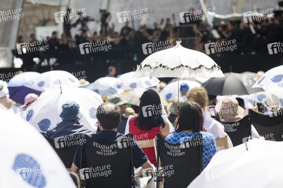 Klassik, Musik, Konzert, Auftritt, Bühne, live, Unterhaltung, Entertainment, Kultur, Open Air, Gratis Konzert, Staatskapelle Berlin, Orchester, Musiker, Gratiskonzert, Gratisveranstaltung, Stadtmitte, Sonnenschirm, Sonnenschutz, Konzertbesucher, Publikum, Bestuhlung, Menschenmenge