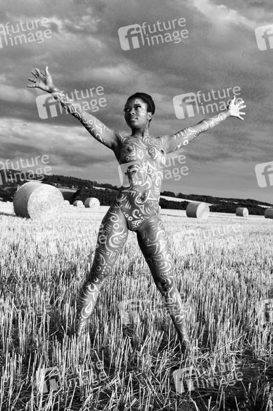 Bodypainting, Erotik, Frau, Mädchen, Afrikanerien, nackt, draußen, weiblich, Körperkunst, Kunst, Ornamente, Malerei, Feld, Acker, Stoppelfeld, Heuballen, Stroh, Landwirtschaft, Ernte, Abendsonne, erotic, African woman, girl, nude, outdoor, female, body art, body painting, ornaments, field, hay, straw, farming, harvest, evening sun
