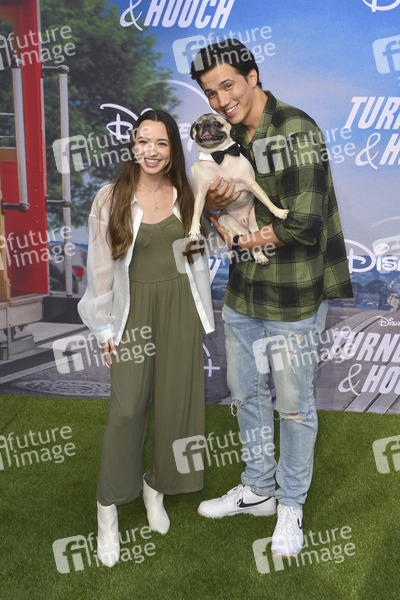 Veronica Merrell, Aaron Burriss mit Hund Guppy the Pug bei der Premiere der Disney+ TV-Serie 'Turner & Hooch' im Westfield Century CityMall Atrium. Los Angeles, 15.05.2021
