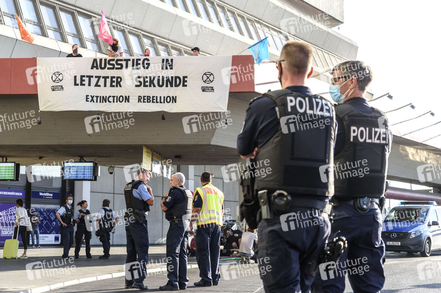 Umweltaktivisten von Extinction Rebellion (XR) protestieren vor dem Eingang des Terminals des Flughafen Berlin-Tegel gegen den innerdeutschen Flugverkehr. Damit wollen Sie auf den erheblichen CO2-Ausstoß bei Inlandflügen hinweisen. Ähnliche Aktionen finden auch in München, Lübeck und Düsseldorf statt.Berlin, 17.08.2020