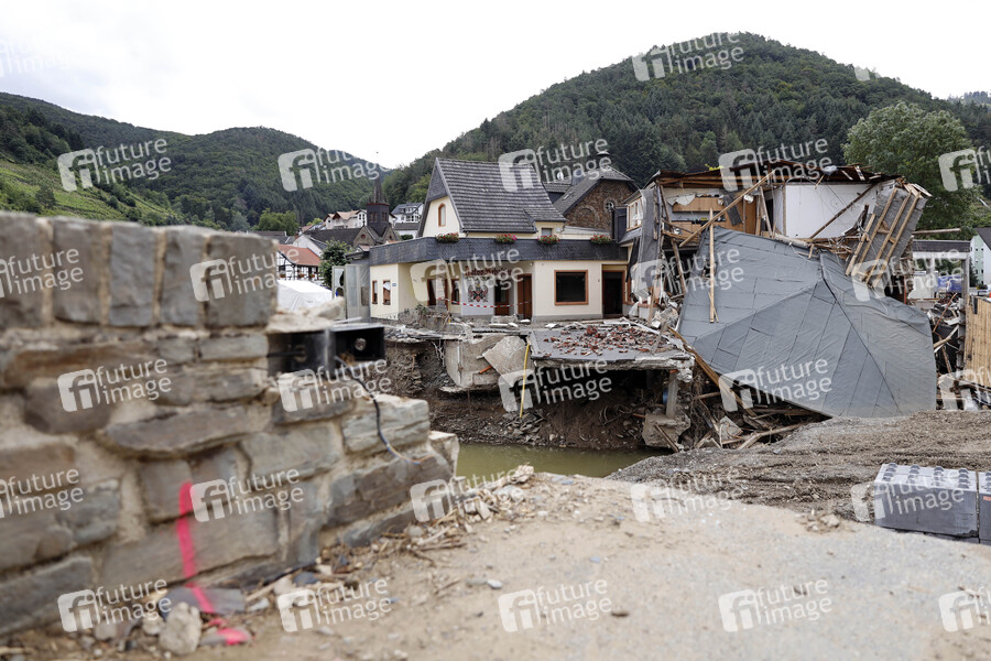 Nach dem Jahrhunderthochwasser in der Eifel durch heftige Regenfälle und Dauerregen mit Überschwemmungen und Überflutungen haben die Aufräumarbeiten im Ahrtal große Fortschritte gemacht. Einheiten von Polizei, THW, Bundeswehr und Feuerwehr mitsamt vielen freiwilligen Helfern haben Straßen geräumt, Schutt und Schlamm entfernt und die Menschen versorgt. Der Wiederaufbau wird trotzdem Jahre dauern. Im Bild Flutschäden in der Ortschaft Rech, in der die Flut viele Häuser zerstörte, 08.08.2021