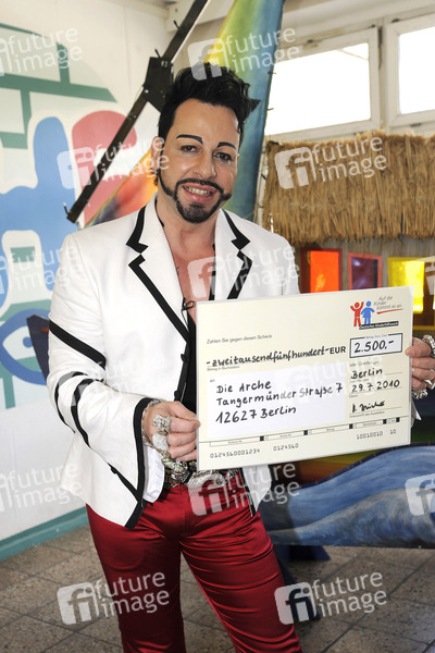 Harald Glööckler überreicht dem Kinderprojekt Arche im Namen des Deutschen Kinderhilfswerkes e.V. einen Scheck in Höhe von 2500 Euro im Christlichen Kinder- und Jugendwerk Die Arche e.V. in Hellersdorf, Berlin