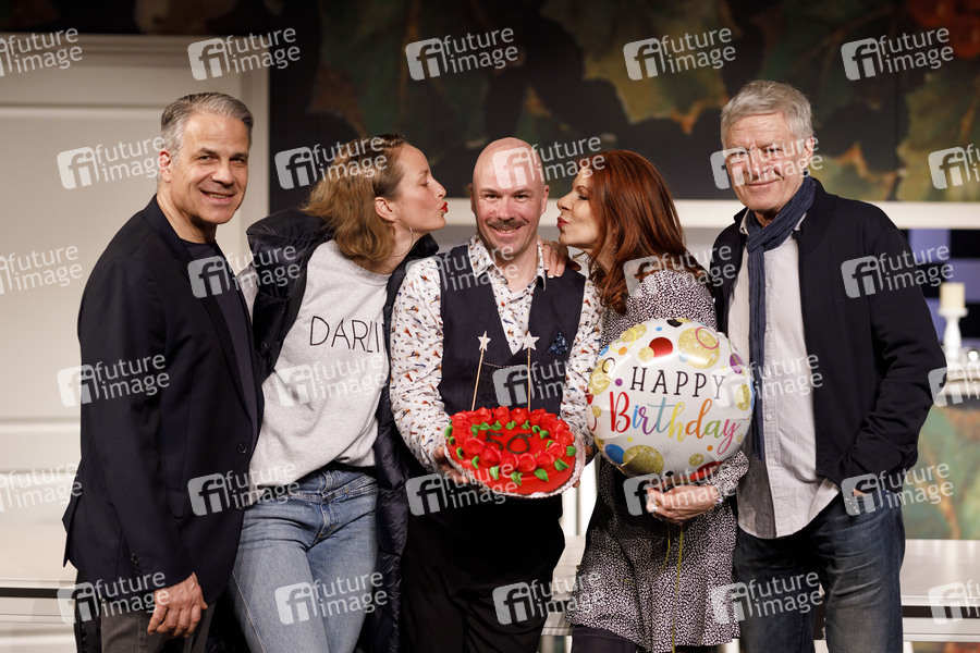 Karsten Speck, Lara Joy Körner, Urs Schleiff, Claudia Wenzel und Rüdiger Joswig bei der Gratulation zum 50. Geburtstag von Urs Schleiff, dem Regisseur des Stücks 'Alle unter einer Tanne', im Theater am Dom. Köln, 31.01.2020