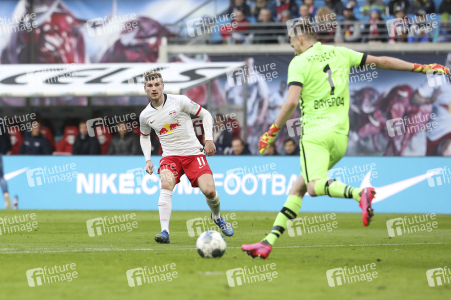 Timo Werner und Lukas Hradecky beim Fußballspiel RB Leipzig - Bayer 04 Leverkusen ( Endstand 1:1 ) am 24. Spieltag der Fußball-Bundesliga in der Red Bull Arena. Leipzig, 01.03.2020