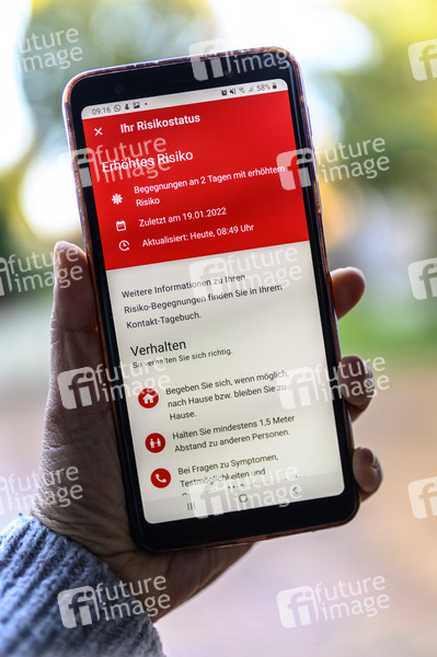 Die Corona-Warn-App zeigt auf einem Handy den Status 'erhöhtes Risiko' aufgrund möglicher Begegnungen mit positiven Kontaktpersonen an. (Themenbild, Symbolbild) Frechen, 24.01.2022