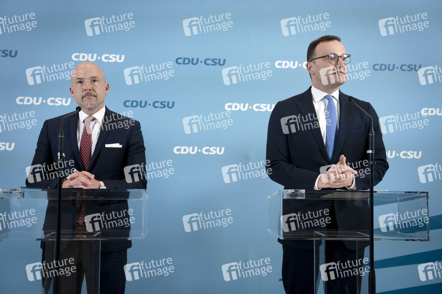 Alexander Hoffmann und Jens Spahn beim Pressestatement zur Fraktionssitzung der CDU/CSU-Bundestagsfraktion im Reichstagsgebäude. Berlin, 03.06.2025