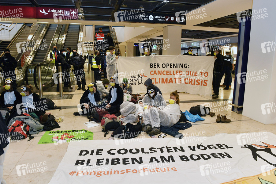 Klimaaktivisten der Aktionsgruppe 'Am Boden bleiben' protestieren gegen die Eröffnung des Flughafens Berlin-Brandenburg (BER). Schönefeld, 31.10.2020