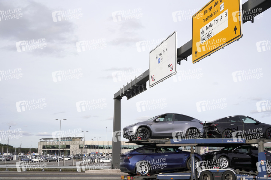 Ein Autotransporter mit fabrikneuen Tesla Pkw fährt unter Schilderbrücke an Gigafactory vorbei. Die Erweiterungspläne für die Fabrik des Elektroautobauers Tesla in Grünheide (Oder-Spree) bei Berlin sind bei einer Einwohnerbefragung mehrheitlich auf Ablehnung gestoßen. Doch das Votum ist letztlich nicht bindend. Tesla will neben dem 300 Hektar großen Werksgelände einen Güterbahnhof, Lagerhallen und einen Betriebskindergarten errichten. Dafür müssten aber rund 100 Hektar Wald gerodet werden. Das ist umstritten. Es gibt Befürworter der Pläne, aber auch Ablehnung einer Tesla-Erweiterung (Quelle: rbb24). Grünheide, 23.02.2024