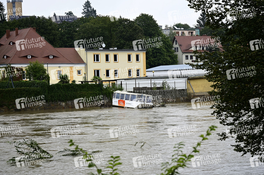 Ein Touristenschiff stehr quer in der Strömung, Nahe der der Altstadtbrücke. An der Neiße in Görlitz wurde am Morgen um 8:00 Uhr der Scheitelpunkt erreicht. Bei einem Wert von 5,57 m, bei einem Durchfluss von 309 m3/s, lag dieser 3 Zentimeter unterhalb der Alarmstufe 4. Seit dem geht der Wasserstand der Neiße langsam zurück. Der aktuelle Pegelstand beträgt 5,18 m. Görlitz, 16.09.2024