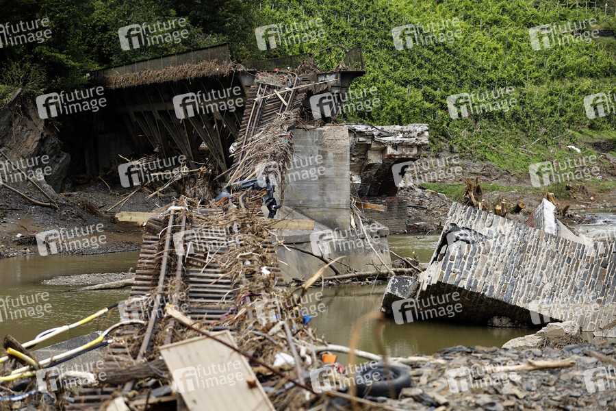 Nach dem Jahrhunderthochwasser in der Eifel durch heftige Regenfälle und Dauerregen mit Überschwemmungen und Überflutungen haben die Aufräumarbeiten im Ahrtal große Fortschritte gemacht. Einheiten von Polizei, THW, Bundeswehr und Feuerwehr mitsamt vielen freiwilligen Helfern haben Straßen geräumt, Schutt und Schlamm entfernt und die Menschen versorgt. Der Wiederaufbau wird trotzdem Jahre dauern. Im Bild Flutschäden an einer Brücke zwischen Rech und Mayschoß, die durch die Flut beschädigt wurde, 08.08.2021