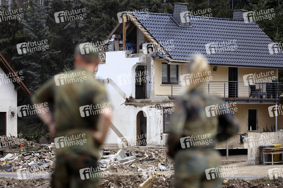 Nach dem Jahrhunderthochwasser in der Eifel durch heftige Regenfälle und Dauerregen mit Überschwemmungen und Überflutungen haben die Aufräumarbeiten im Ahrtal große Fortschritte gemacht. Einheiten von Polizei, THW, Bundeswehr und Feuerwehr mitsamt vielen freiwilligen Helfern haben Straßen geräumt, Schutt und Schlamm entfernt und die Menschen versorgt. Der Wiederaufbau wird trotzdem Jahre dauern. Im Bild Soldaten und Flutschäden in der Ortschaft Dernau, in der die Flut viele Häuser zerstörte, 30.07.2021