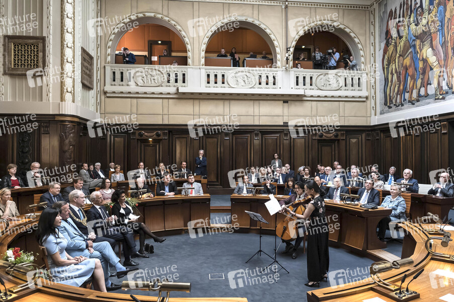 Schröder-Kim So-yeon, Gerard Schröder, Stefan Schostok, Madrid Samii, Mashid Samii und Gäste beim Empfang zum 75. Geburtstag von Ehrenbürger und Bundeskanzler a.D. Gerhard Schröder im Neuen Rathaus. Hannover, 24.04.2019