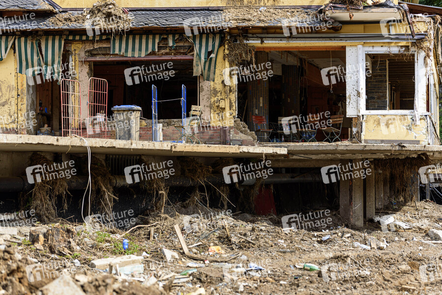 Nach dem Jahrhunderthochwasser in der Eifel durch heftige Regenfälle und Dauerregen mit Überschwemmungen und Überflutungen haben die Aufräumarbeiten im Ahrtal große Fortschritte gemacht. Einheiten von Polizei, THW, Bundeswehr und Feuerwehr mitsamt vielen freiwilligen Helfern haben Straßen geräumt, Schutt und Schlamm entfernt und die Menschen versorgt. Der Wiederaufbau wird trotzdem Jahre dauern. Im Bild Flutschäden in der Ortschaft Mayschoß, in der die Flut viele Häuser zerstörte, 08.08.2021