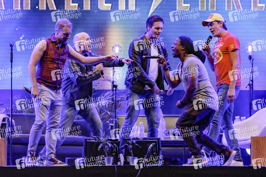 Oliver Pocher, Dittmar Bachmann, Alexander Klaws, Mola Adebisi und Matze Kop mit dem Programm 'Gefährlich ehrlich' live bei der Autokultur-Konzert-Reihe auf dem Schützenplatz. Hannover, 12.07.2020