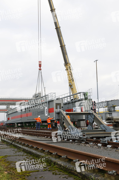 Portalkran beim Fototermin 'DB montiert 400 Tonnen schwere neue Krananlage' im DUSS-Terminal Köln-Eifeltor. Köln, 23.01.2025