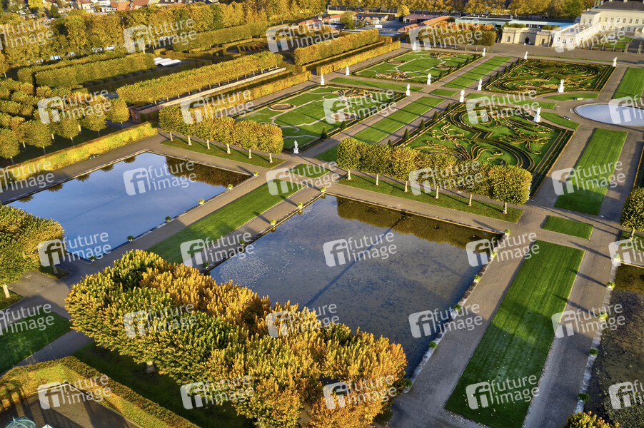 Luftbild der Herrenhäuser Gärten im Herbst (Flug ordnungsgemäß bei der Polizei Hannover-Stöcken angemeldet. Schriftliche Bildfreigabe der Pressestelle der Herrenhäuser Gärten Hannover erteilt durch Frau Anja Kestennus). Hannover, 23.10.2021
