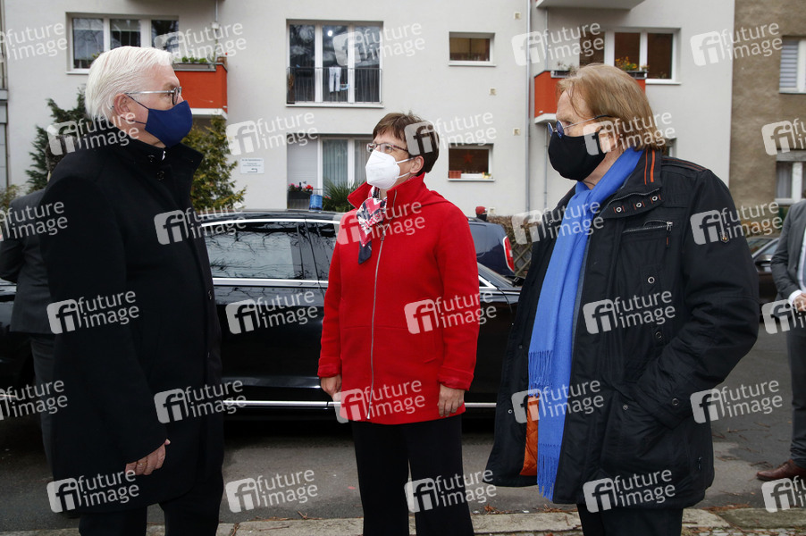 Bundespräsident Frank-Walter Steinmeier, Ulrike Kostka und Frank Zander im Gespräch beim Besuch eines Caritas-Foodtruck. Berlin, 16.12.2020