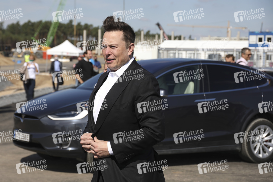 Elon Musk beim ersten Richtfest auf der Baustelle der Tesla Gigafactory Berlin-Brandenburg. Grünheide, 03.09.2020