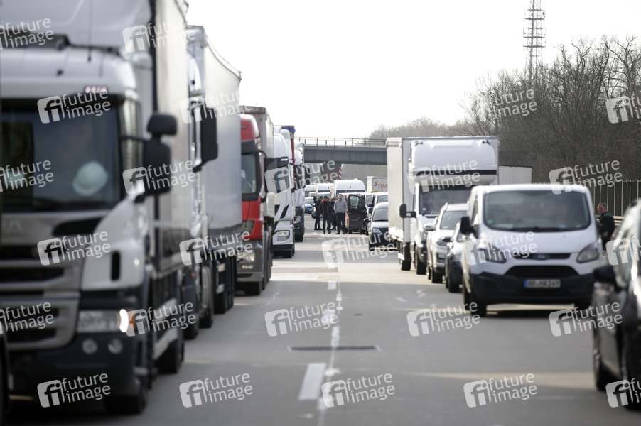 Autos stauen sich auf A12 kurz vor der polnischen Grenze. Die Grenzen zwischen Polen und Deutschland sind wegen des Coronavirus geschlossen. Küstrin, 16.03.2020