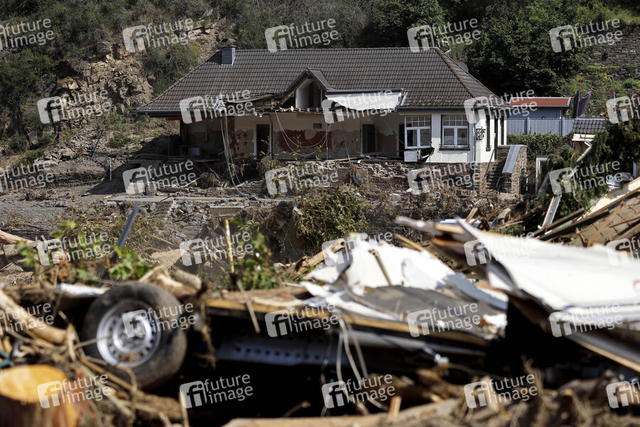 Nach dem Jahrhunderthochwasser in der Eifel durch heftige Regenfälle und Dauerregen mit Überschwemmungen und Überflutungen haben die Aufräumarbeiten im Ahrtal begonnen. Einheiten von Polizei, THW, Bundeswehr und Feuerwehr mitsamt vielen freiwilligen Helfern räumen Straßen, entfernen Schutt und Schlamm und versorgen die Menschen. Im Bild zerstörte Häuser und Autos in der Ortschaft Altenahr, in der die Flut viele Häuser zerstörte, 22.07.2021