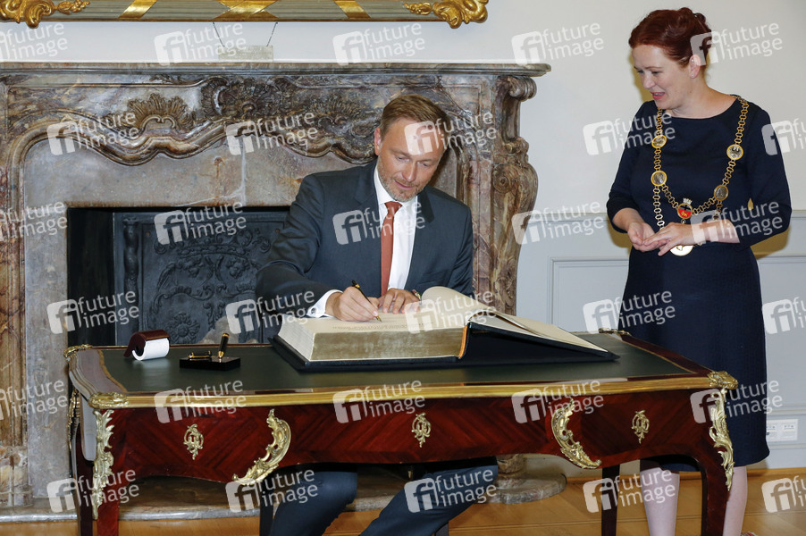Christian Lindner und Katja Dörner beim Bildtermin vom Eintrag einiger G7-Finanzminister und Notenbankgouverneure ins Goldene Buch der Stadt Bonn im Alten Rathaus. Bonn, 19.05.2022