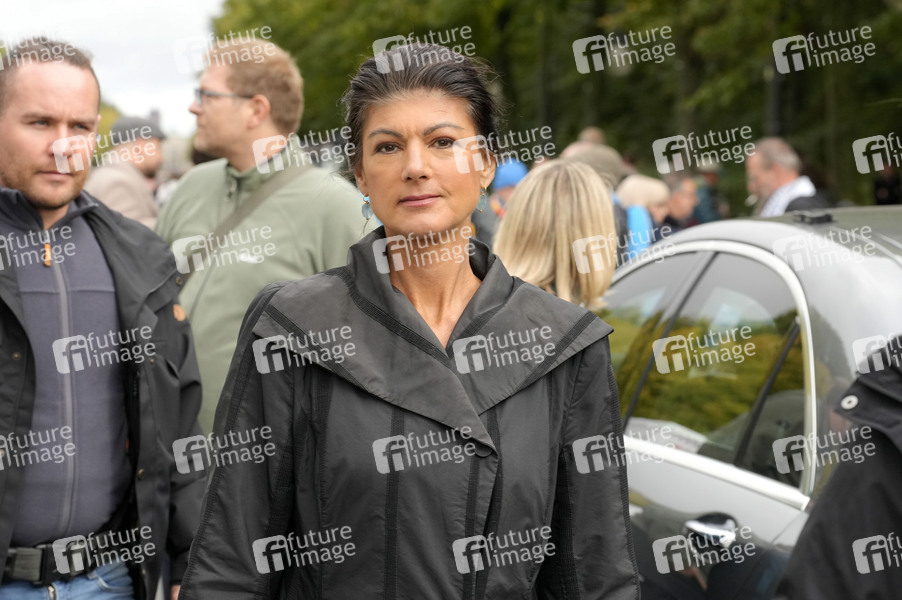 Sahra Wagenknecht bei der Friedensdemonstration unter dem Motto 'Nein zu Krieg und Hochrüstung! Ja zu Frieden und internationaler Solidarität' vor der Siedessäule am Großen Stern. Berlin, 03.10.2024