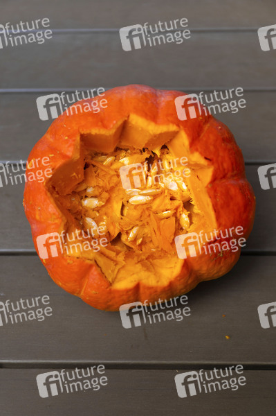 Kürbis schnitzen, Kürbisse, Cucurbita, Halloween, Herbst, Kürbisfruchtfleisch, Kürbiswände, Kürbis Gesicht, Kürbis-Schnitzset, Deko, Symbolbild, Themenbild