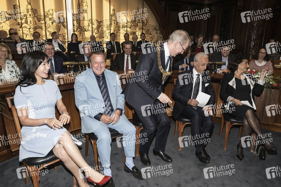 Schröder-Kim So-yeon, Gerard Schröder, Stefan Schostok, Madrid Samii und Mashid Samii beim Empfang zum 75. Geburtstag von Ehrenbürger und Bundeskanzler a.D. Gerhard Schröder im Neuen Rathaus. Hannover, 24.04.2019