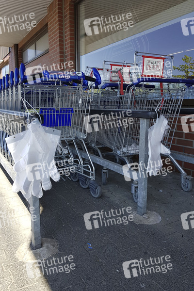 Schutzhandschuhe für Einkaufswagen - Coronaschutzmaßnahmen beim Einkaufen im Einkaufzentrum. Springe, 24.04.220