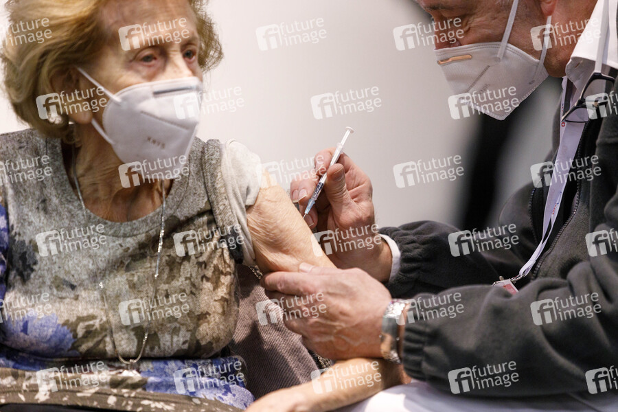 Das Kölner Impfzentrum in den Hallen der Koelnmesse hat eröffnet. Zuerst werden dort nun die Über-80-Jährigen geimpft – vorausgesetzt sie haben einen der Impftermine bekommen. Aufgrund der Verzögerung bei den Impfstoff-Lieferungen der Hersteller Biontech und Pfizer musste der Impfstart in NRW bis nun verschoben werden. Elisabeth Steubesand, mit 105 Jahren die älteste Kölnerin, war die erste Patientin, die im Impfzentrum ihre Impfung erhielt. (Themenbild, Symbolbild) Köln, 08.02.2021