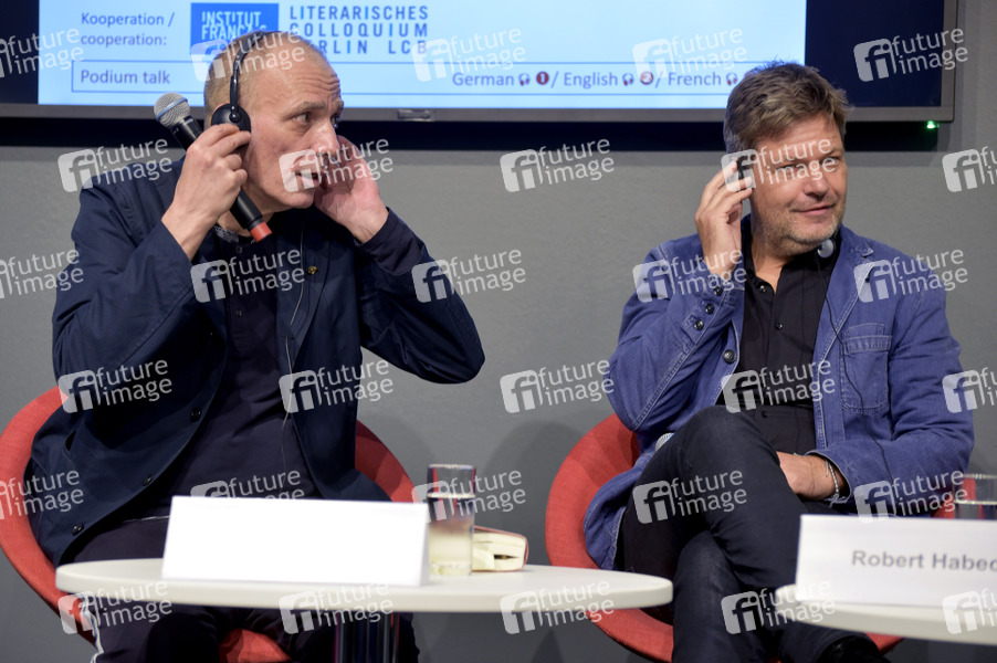 Cord Riechelmann und Roland Habeck bei der Podiumdiskussion 'Kranke Haltung: Das Mensch-Tier-Verhältnis in der industriell betriebenen Zucht' auf der 71. Frankfurter Buchmesse 2019 auf der Messe Frankfurt. Frankfurt am Main, 16.10.2019