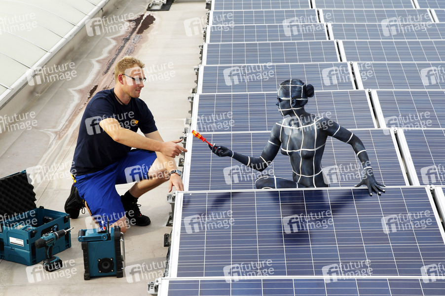 Solardach-Pflicht, Solarpflicht, Klimaschutz-Sofortprogramm 2022, Energie-Standard EH-55, Energie, Solarstrom, Solarzelle, Photovoltaik, Solarpanele, Solarenergie, Sonnenenergie, Solaranlage, Dach, Solarmodule, Nachhaltigkeit, Erneuerbare Energien, Energiewende, Solarzellen, Klima, Umwelt, Ökostrom, Umweltschutz, Body-Painting, Akt, Körperkunst, Körperfarben, Farbe, Bemalung, Kunst, Malerei, Beruf, Solarteur, Strom, Symbolfoto, Symolbild, Model Release