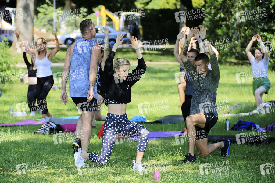 Caro Daur und Fitnesscoach Marcus zu Solms veranstalten auf einer Wiese an der Alster in Hamburg ein Charity Fitness Workout, um Spenden für Menschen in Yemen zu sammeln. Bisher kamen mehr als 15.000 Euro zusammen. Hamburg, 27.06.2020
