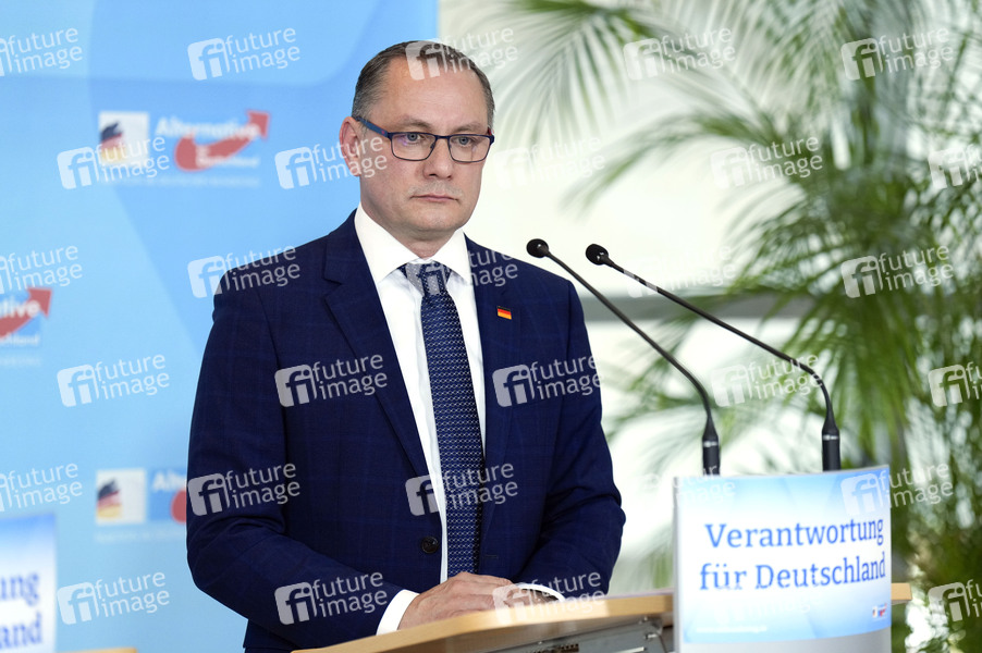 Tino Chrupalla beim Pressestatement zur Fraktionssitzung der AfD-Bundestagsfraktion im Reichstagsgebäude. Berlin, 23.04.2024