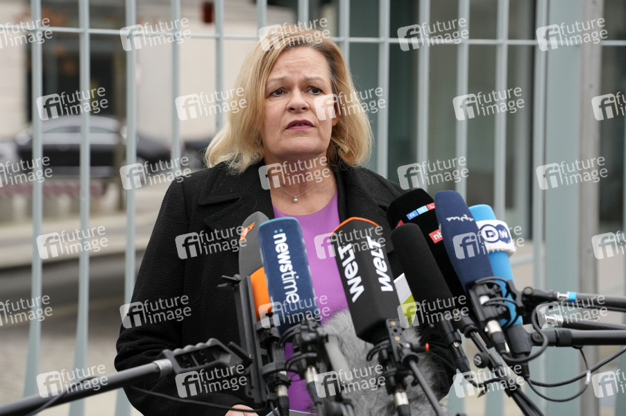 Nancy Faeser bei einer Pressekonferenz zum Nationalen Aktionsplan gegen Menschenhandel und Gewaltstrategien vor dem Bundeskanzleramt. Berlin, 11.12.2024