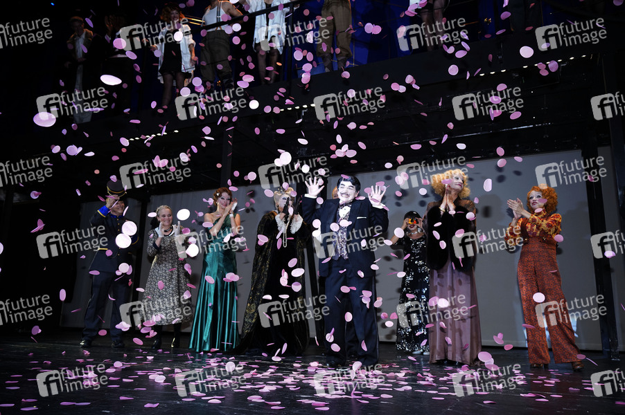 Katharina Thalbach und Ensemble-Mitglieder bei der Verleihung des Publikumspreises Goldener Vorhang an Katharina Thalbach nach der Vorstellung des Theaterstücks 'Mord im Orient-Expess' in der Komödie am Kurfürstendamm im Schiller Theater. Berlin, 11.09.2022