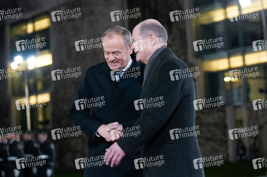 Donald Tusk und Olaf Scholz beim Empfang des Ministerpräsidenten der Republik Polen mit militärischen Ehren zu einem gemeinsamen Gespräch mit dem Bundeskanzler und anschließendem Pressestatement im Bundeskanzleramt. Berlin, 12.02.2024