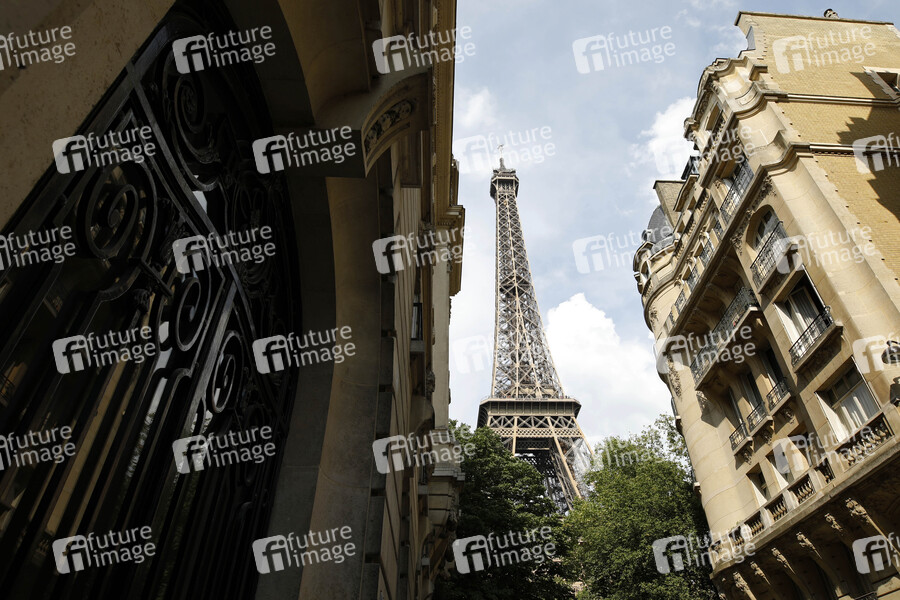 Der Eiffelturm gesehen von der Rue de Buenos Aires aus. Der Eiffelturm ist ein 324 Meter hoher Eisenfachwerkturm in Paris. Er steht im 7. Arrondissement am nordwestlichen Ende des Champ de Mars, nahe dem Ufer der Seine. Paris, 01.08.2019