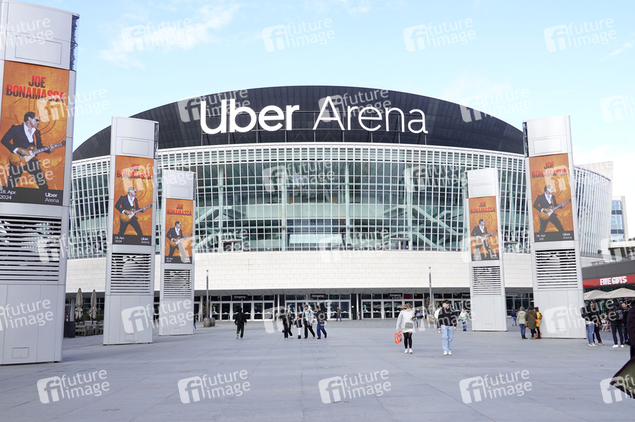 Neuer Schriftzug nach der Umbenennung der Mercedes-Benz Arena in Uber Arena. Im September 2008 wurde die Mehrzweckhalle erstmals als 'o2-World' eröffnet, mit 17.000 Plätzen ist es die größte Halle dieser Art in Berlin und die zweitgrößte Deutschlands. 2015 wechselte Name und Sponsor dann in Mercedes-Benz-Arena. Berlin, 23.03.2024