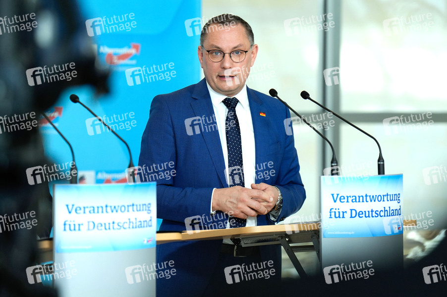 Tino Chrupalla beim Pressestatement zur Fraktionssitzung der AfD-Bundestagsfraktion im Reichstagsgebäude. Berlin, 19.03.2024