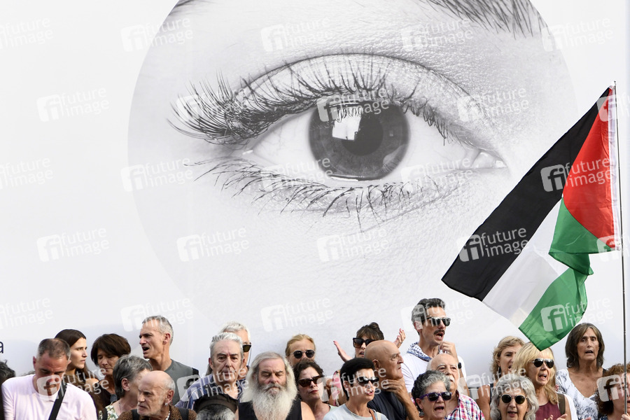 Anti-Israel-Demo, Demonstration, Protest, Filmpremiere, Premiere, Kino, Film, Eröffnung, Opening Ceremony, Eröffnungsgala, Roter Teppich, Ankunft, Unterhaltung, Entertainment, Kultur, Filmfest, Internationales Filmfestival, SSIFF, 73rd San Sebastian International Film Festival, Donostia Zinemaldia - Festival de San Sebastián