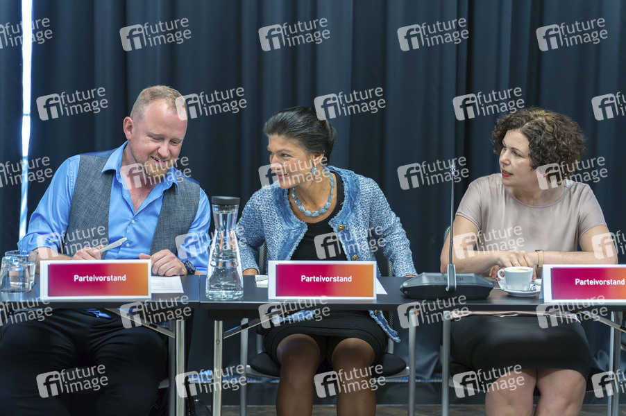 Christian Leye, Sahra Wagenknecht und Amira Mohamed Ali bei der Klausurtagung des BSW-Parteivorstands im Hotel AMANO Grand Central. Berlin, 28.06.2025