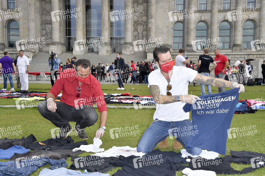 Sascha Vollmer und Alec Völkel von The BossHoss legen ihr letztes Hemd vor dem Reichstagsgebäude ab - Unter dem Motto #AlarmstufeRot protestieren Mitarbeiter der Kultur-und Veranstaltungsbranche in Berlin für Soforthilfen für die Veranstaltungswirtschaft. Durch die Schließungen und Absage von Veranstaltungen während der Corona-Pandemie stehen viele Kulturschaffende, Veranstalter, Messe- oder Bühnenbauer, Techniker und Kunstschaffende vor dem Aus. Berlin, 09.09.2020