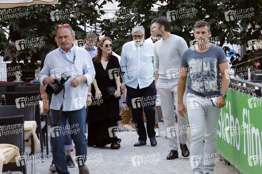 Julianne Moore mit Ehemann Bart Freundlich und Festivalleiter Jiri Bartoska bei einem Stadtbummel auf dem 54. Internationalen Filmfestival Karlovy Vary 2019. Karlsbad, 27.06.2019