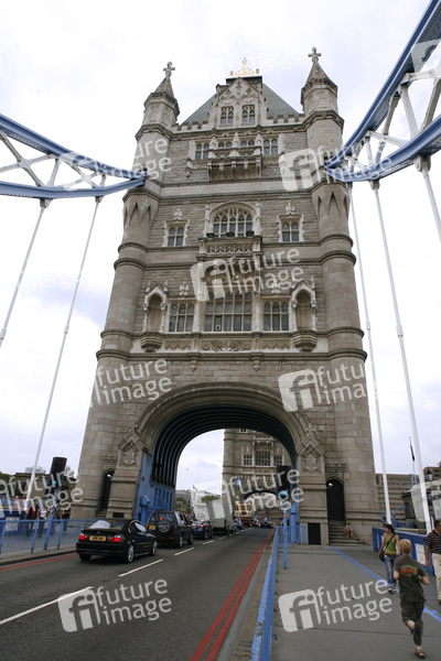 Klappbrücke, Neugotik, 244 Meter lang, Höhe der Brückentürme 65 Meter, die Fahrbahn zwischen den 61 Meter voneinander entfernten Türmen liegt neun Meter über dem Fluss, Fußgängerbrücke in 43 Meter Höhe, die beiden Baskülen können bis zu einem Winkel von 83 Grad hochgeklappt werden, Architekt Horace Jones, erbaut 1886 bis 1894, Themse