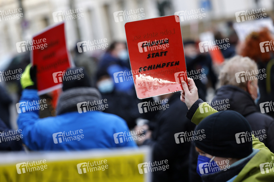 Bei einer angemeldeten Demo unter dem Motto 'Frieden, Freiheit, Selbstbestimmung - Freie Impfentscheidung' demonstrierten etwa 10.000 Gegner einer Impfpflicht mit einem Spaziergang gegen die Corona-Maßnahmen der Bundesregierung und für eine individuelle Impfentscheidung, Grundrechte und 'unversehrte' Kinder - darunter auch viele Pflegekräfte, die wegen der Impfpflicht im Gesundheitsbereich ihren Job zu verlieren drohen. Im Bild Teilnehmer einer Gegendemonstration aus dem linken Spektrum. Düsseldorf, 05.02.2022