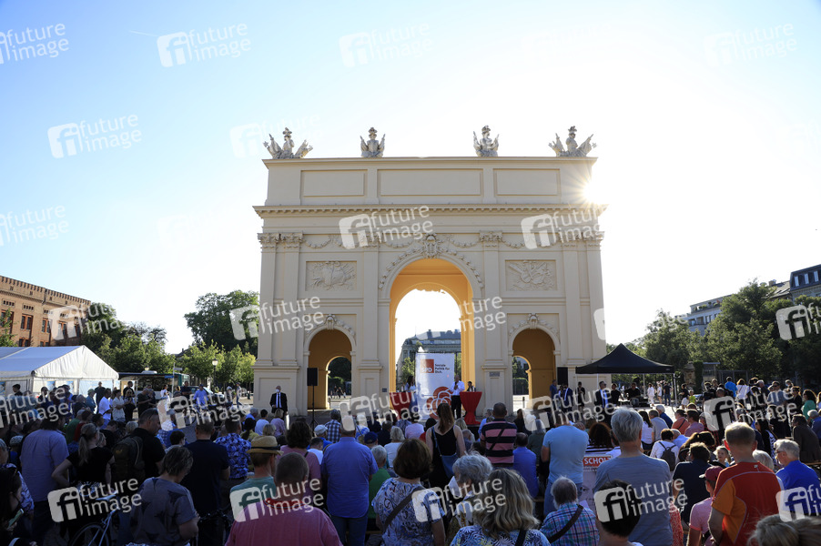 Olaf Scholz bei einem öffentlichen Bürgergespräch vor dem Brandenburger Tor. Potsdam, 30.07.2021